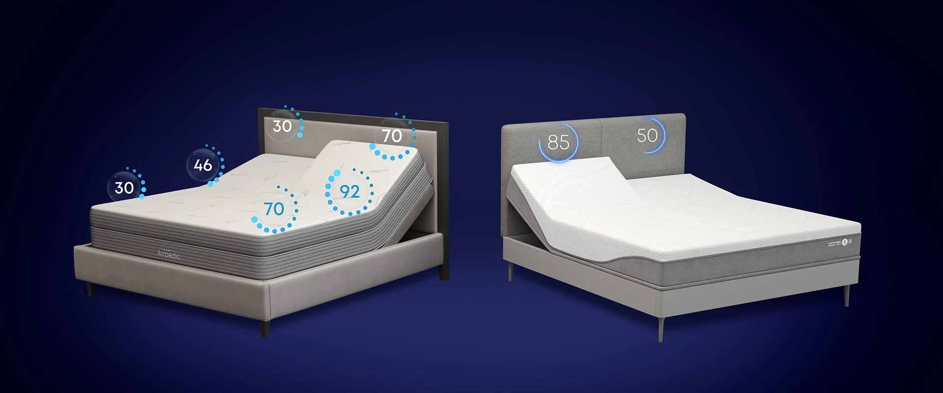 Airpedic® mattresses feature a 6-chamber, multi-zone adjustable air system, for more customized support than a traditional 2-zone design. This allows for dual-side adjustability for overall comfort, and independent adjustments for shoulders and legs, separate from the lumbar mid-section.